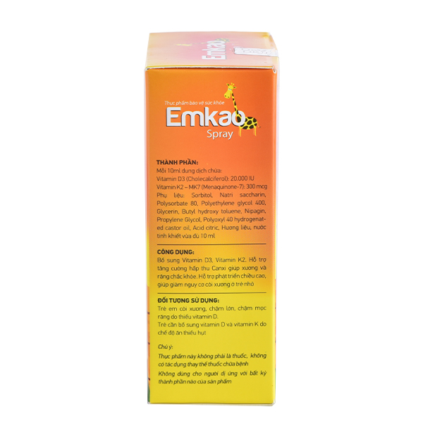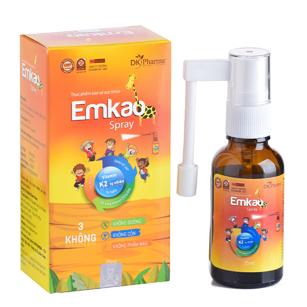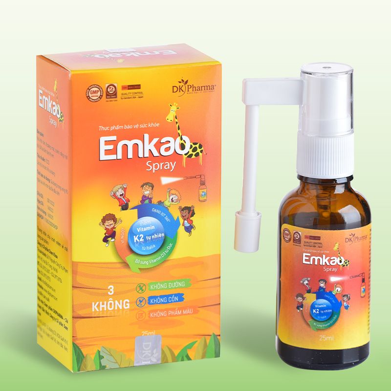 Emkao Spray dạng xịt 360 độ, kích thước nhỏ gọn nên rất tiện dụng cho Ba Mẹ sử dụng. Xịt định liều bổ sung Vitamin D3 từ Đức và Natural Vitamin K2-MK7 từ Ý.